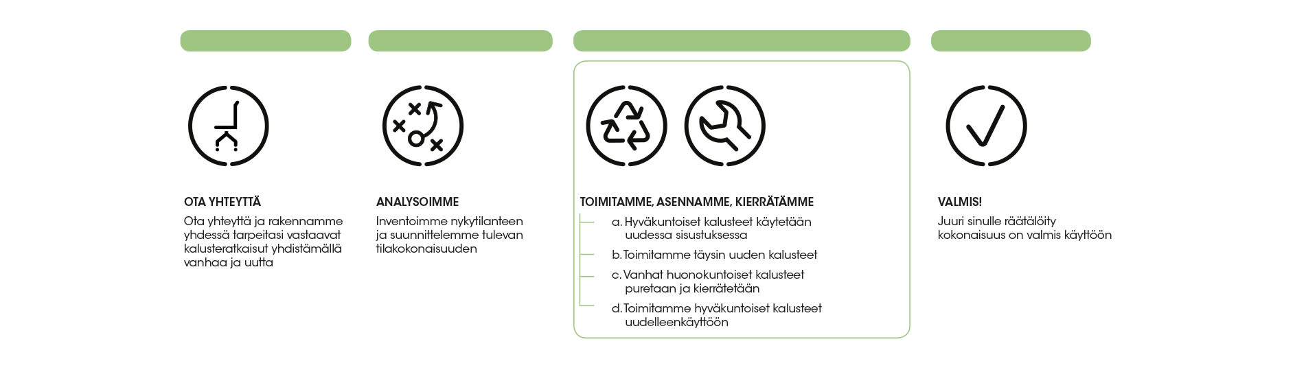 Iskun REALgreen-kiertotalouskonseptin avulla toteutat toimitilojen muuton ja kalustevaihdokset taloudellisesti, vaivattomasti ja tehokkaasti. Uusia toimistokalusteita hankittaessa tai muuton yhteydessä löytyy yleensä kalusteita, jotka eivät enää ole tarpeellisia tai käyttökelpoisia. Suunnittelemme uuden kokonaisuuden yhdessä kanssasi ja huolehdimme puolestasi vastuullisesta kierrättämisestä. Iskun REALgreen on kestävä ja huoleton kiertotalousratkaisu, kun uudistat toimitilasi vastuullisesti.